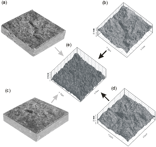 Two fracture surfaces in rocks (a) and (b) (here red granite), can be analysed to provide their surfaces (c) and (d). The method uses a dye thickness approach with a resolution of 15 microns. The two surfaces can be used to calculate the aperture (e). The measurement is done on an optical bench using the OptiProf software (written in-house). Both surfaces and aperture can be analysed for their full fractal physical characteristics using the ParaFrac software (written in-house). Any number of synthetic fractures that have the same physical properties can be calculated using the SynFrac software (written in-house).