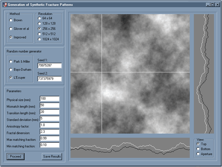 A screen shot of the SynFrac software using the improved Glover et al. method for creating partially correlated fracture surfaces using the physical parameters shown.