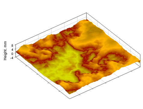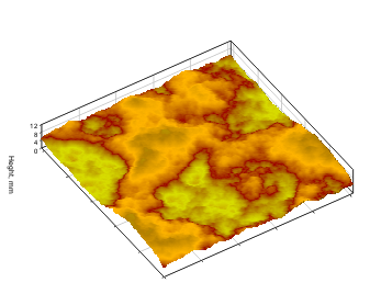 The measured surface of a fracture in pearly granite (left) compared with a synthesised fracture surface with the same physical parameters (right). Note the qualititative similarity even though the surface is obviously quite different.