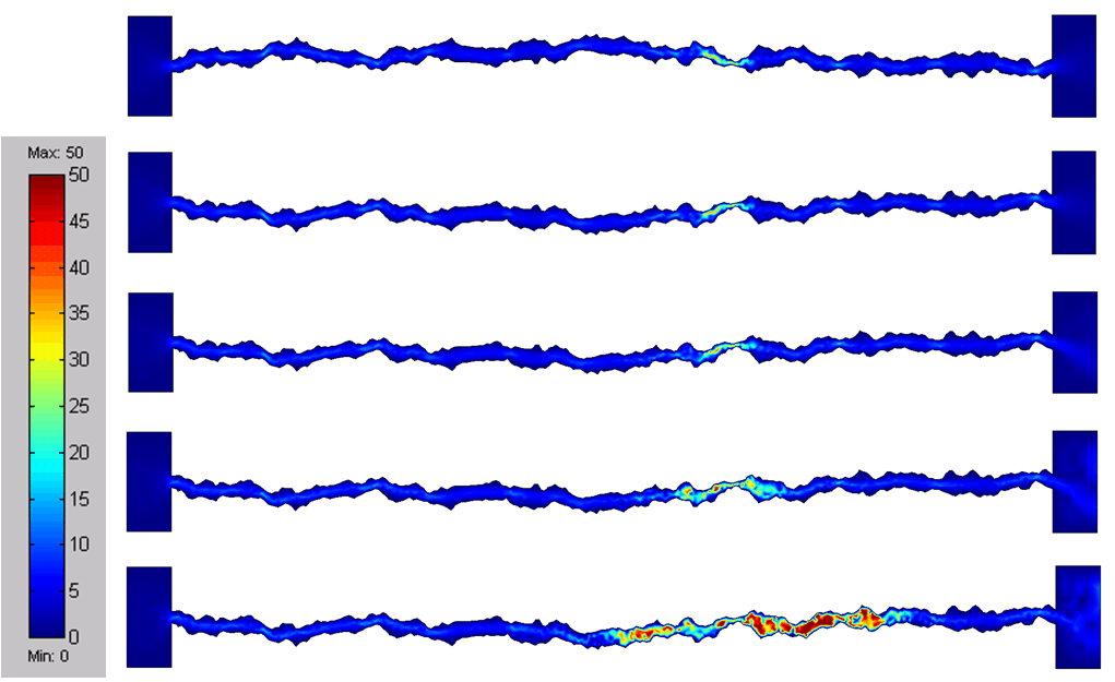 The synthesised fractures can be used in fluid flow modelling in 3D using a supercomputer or in 2D using a desktop computer running FemLab by Comsol Inc. Here the local flow rate is calculated for one section though the 3D model for a range of Reynold's numbers (from top: 0.1, 1, 3, 10, 15).