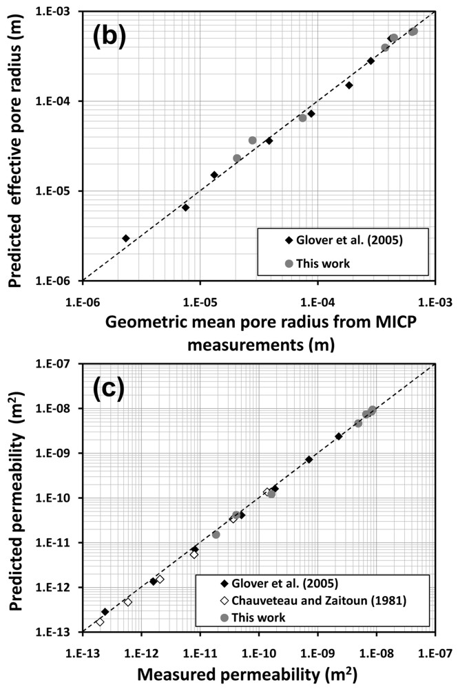Comparison of the measured and predicted effective pore radii and measured permeability for a range of glass bead packs. (b) Predicted effective pore radius, reff as a function of the geometric mean pore radius from MICP measurements. (c) Predicted permeability using the predicted effective pore radius as a function of the measured Klinkenberg permeability.