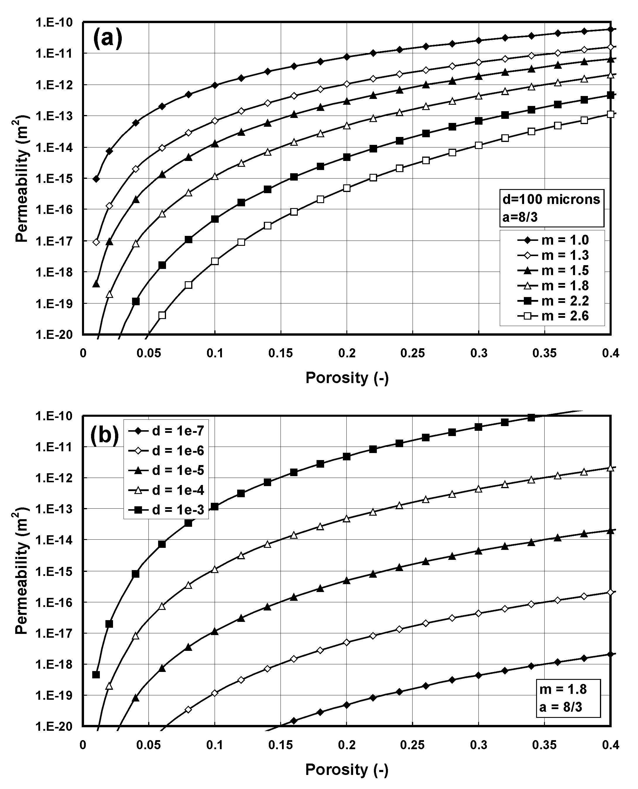 Behaviour of the RGPZ model as a function of its major parameters. Predicted permeability as a function of (a) porosity for various values of cementation exponent, (b) porosity for various values of grain size.
