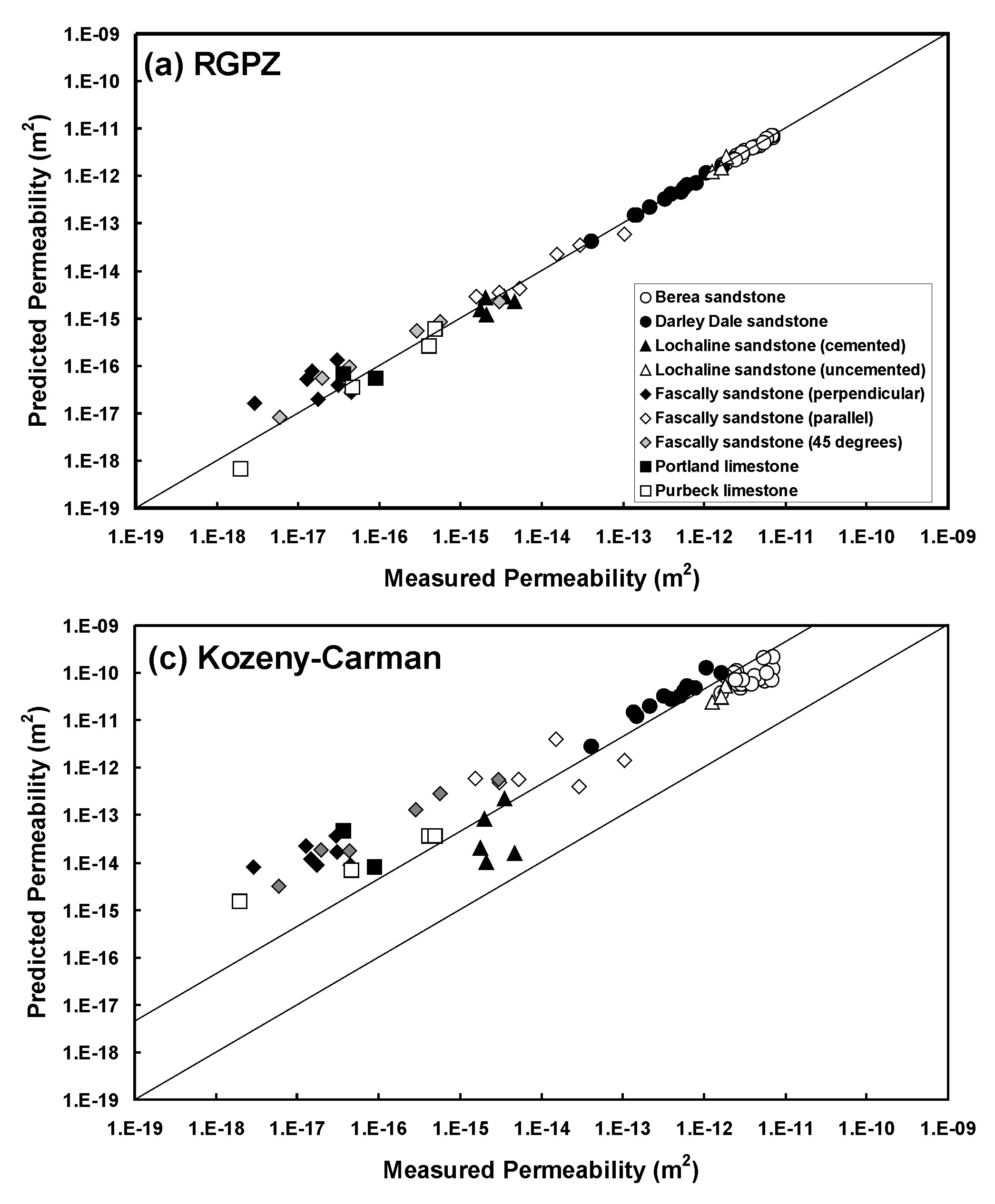 Comparison of the measured and predicted permeabilities for 65 samples of sandstones and carbonates shown in Table 1. (a) RGPZ model, (c) Kozeny-Carman model.